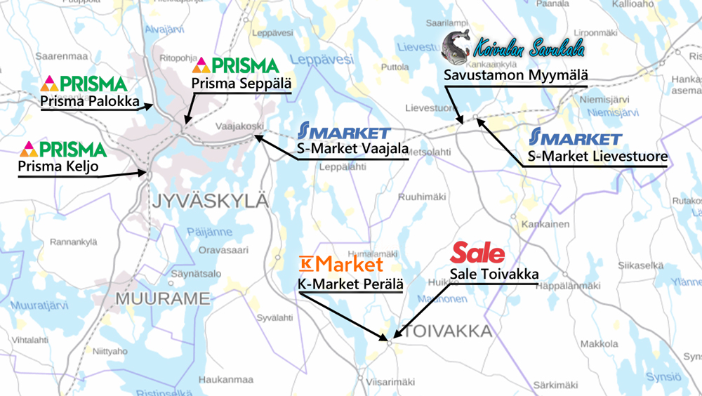 Tuotteitamme voi ostaa oman myymälämme (auki perjantaisin 12-18) lisäksi valikoiduista marketeista ja eri tapahtumista Keski-Suomessa. Toimitamme kauppojen lisäksi kalaa pitopalveluille ja erilaisiin juhliin omasta myymälästämme.